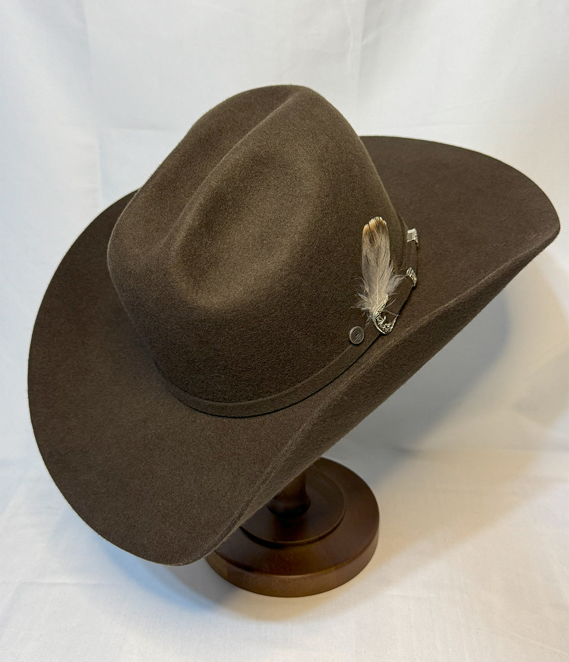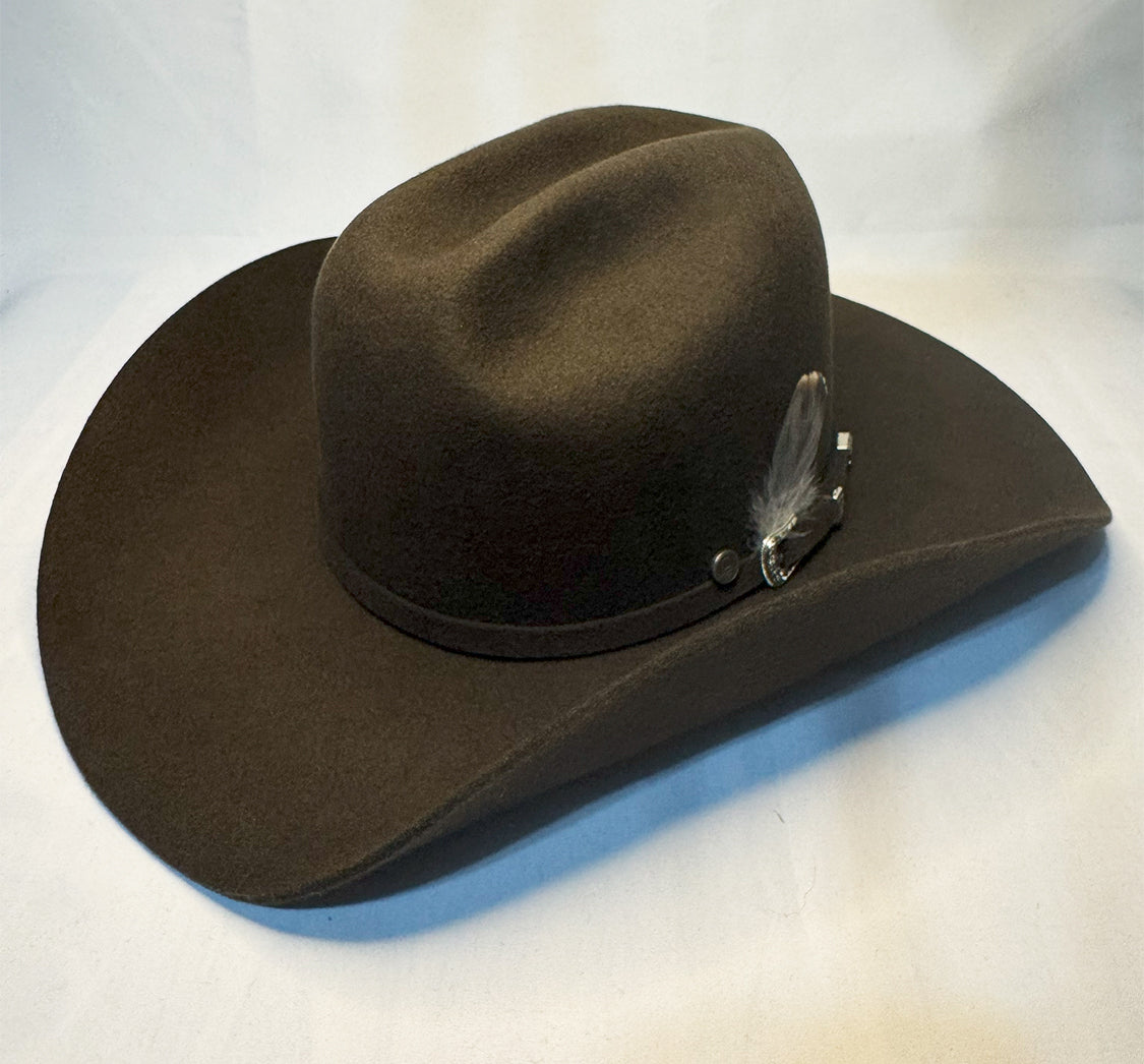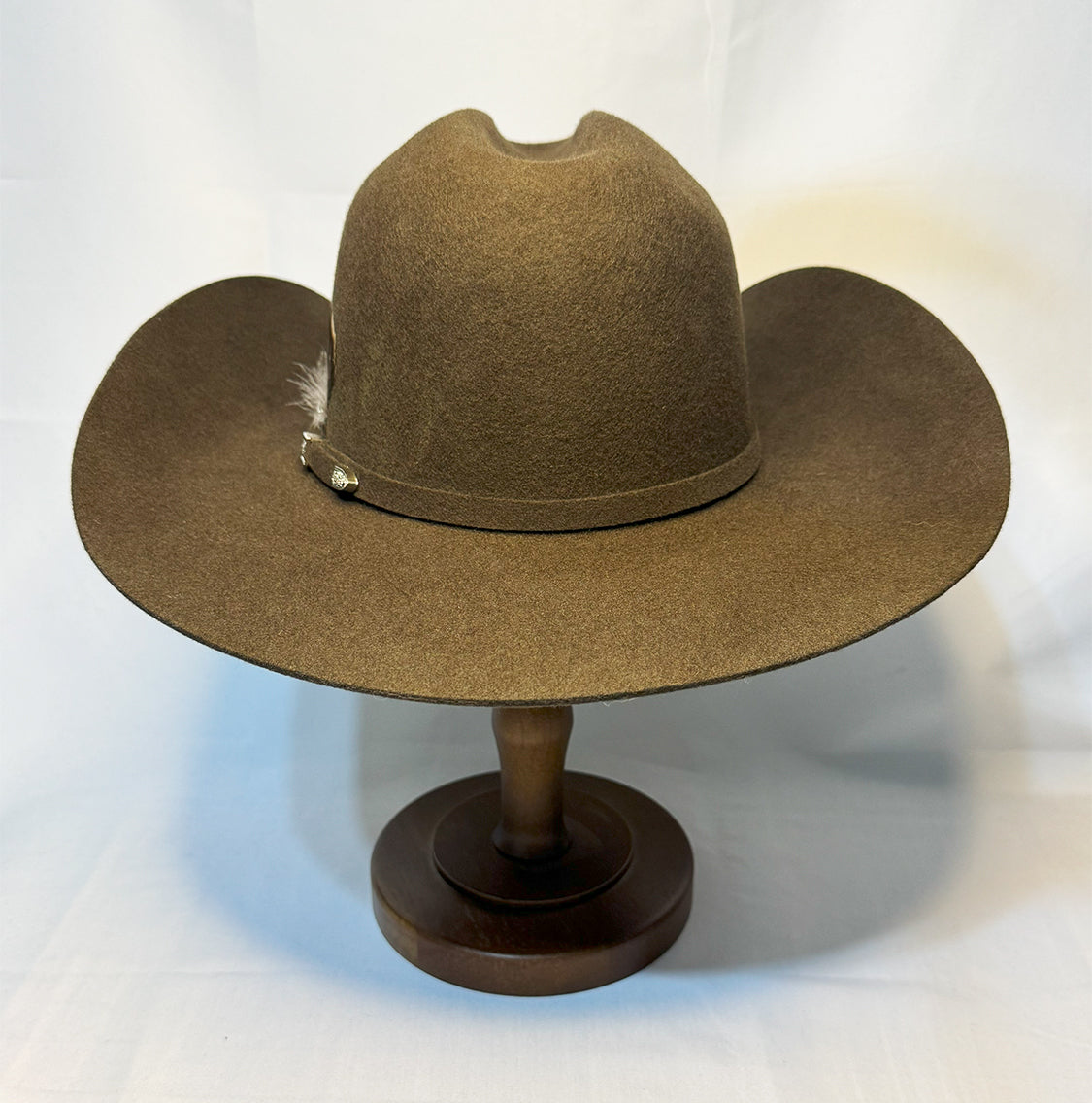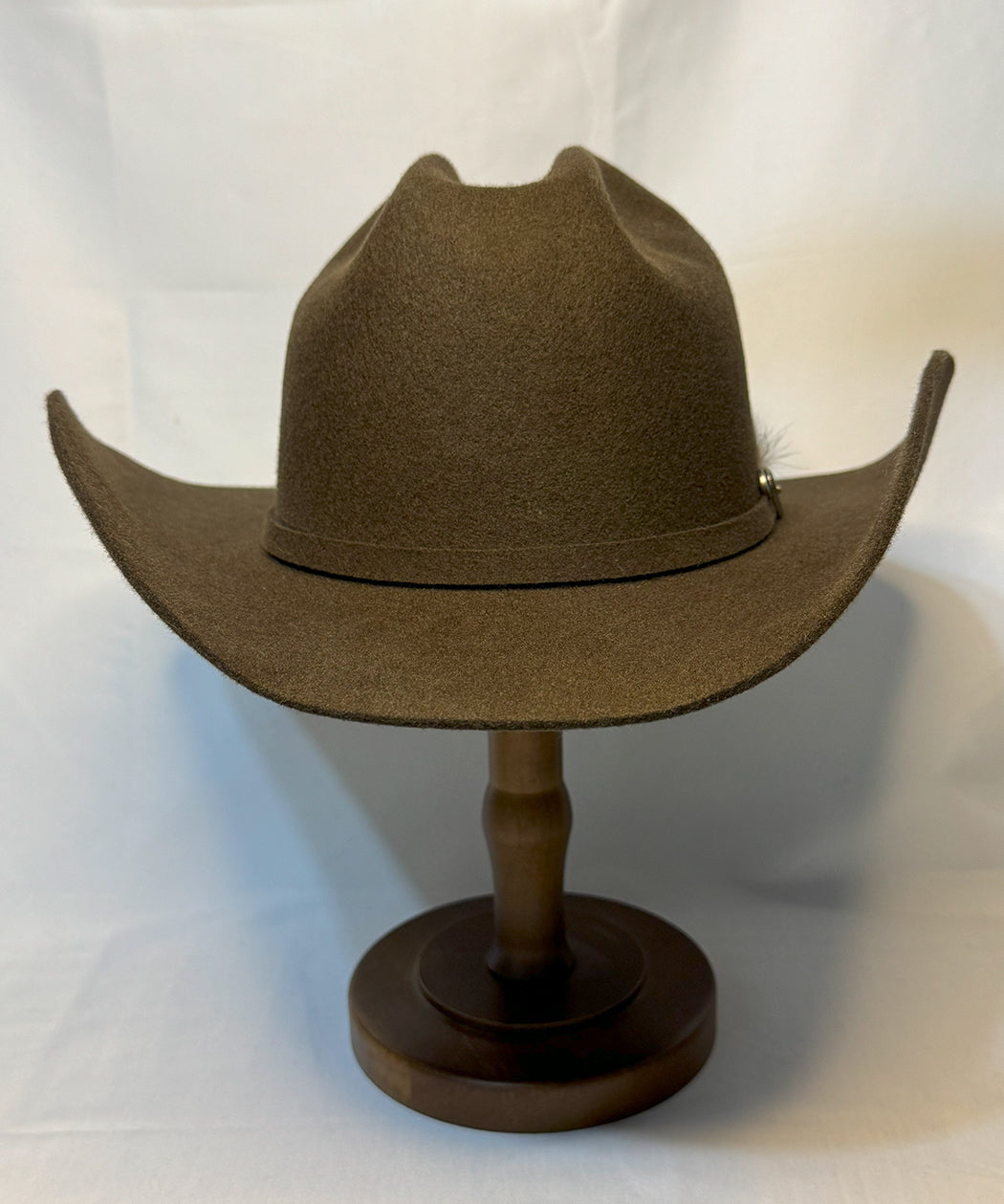 This classic hat is sure to be your next go to! This cattleman crease is a slightly different from the traditional cowboy hat style that features a crease down the middle of the crown and two punch creases on either side. Details includes a sweatband, satin lining, Karda Mendi Hat Pin, Feather and a feather band, as well as a Karda Mendi hat box and “Like Hell If It Is Yours” Hat Card featuring the Troubadour of our family.