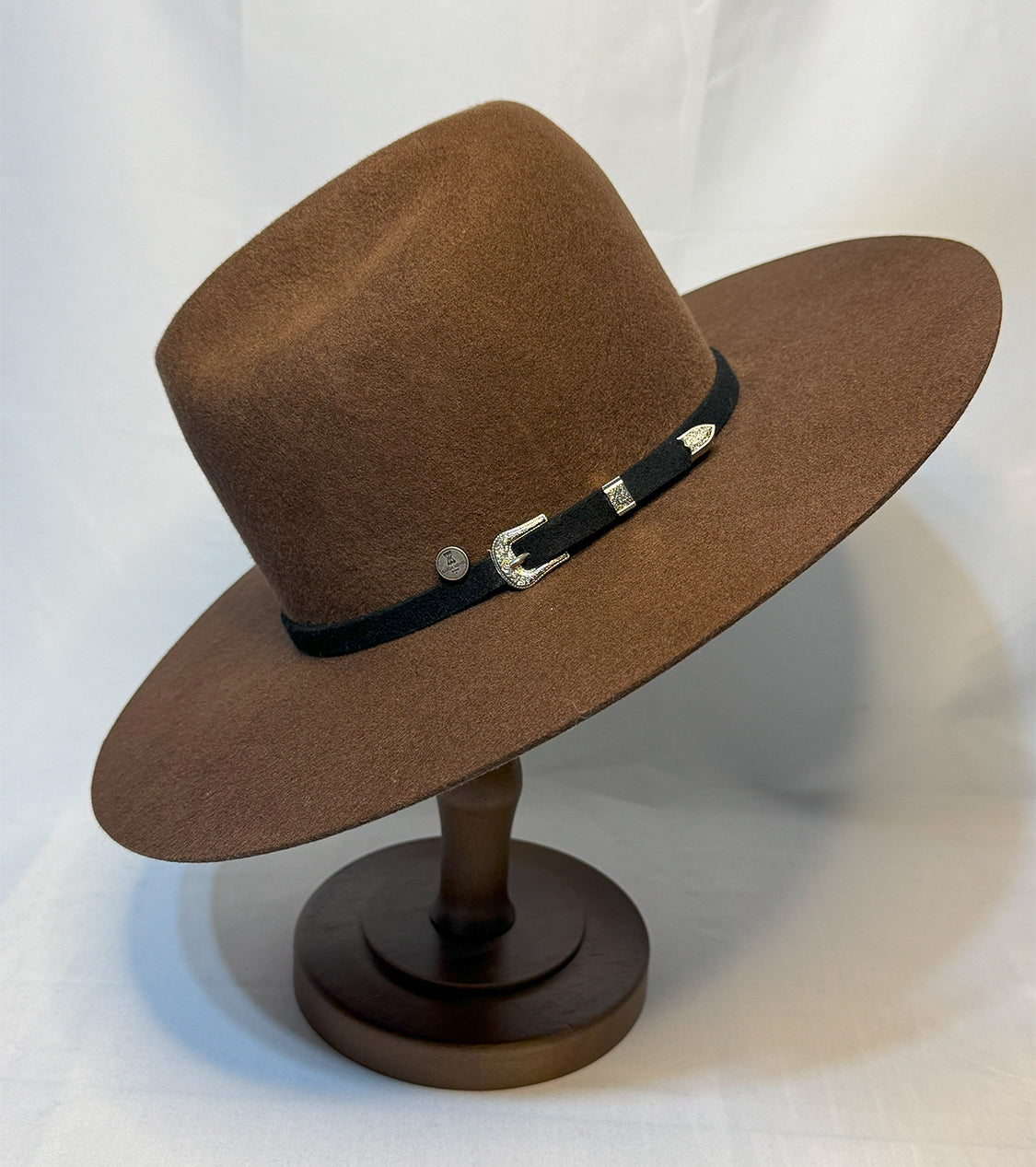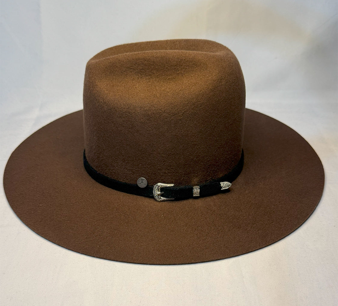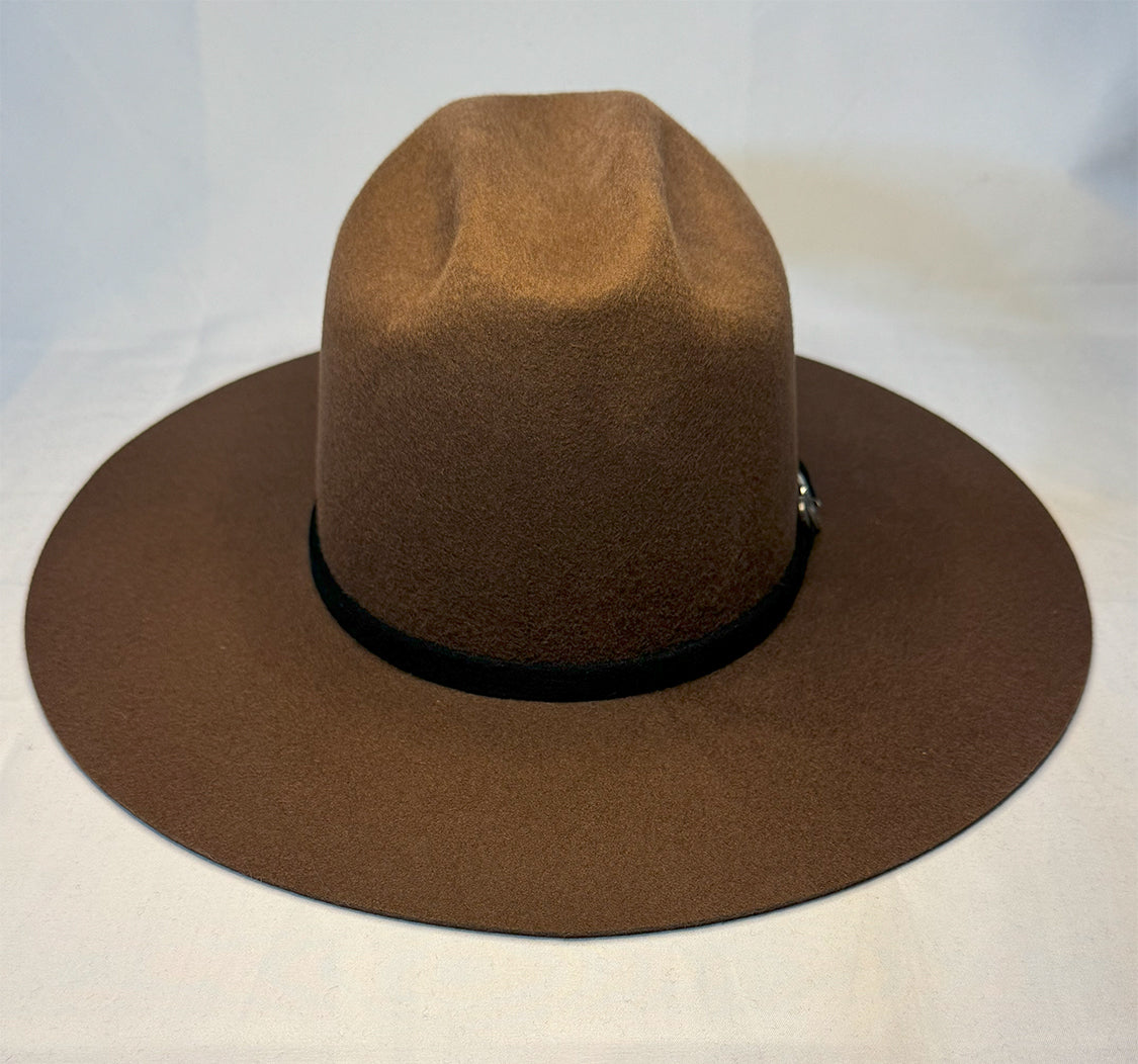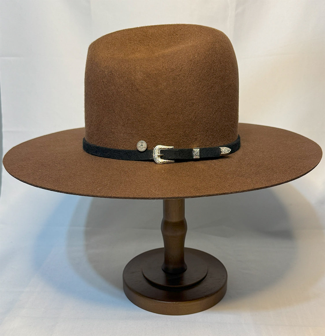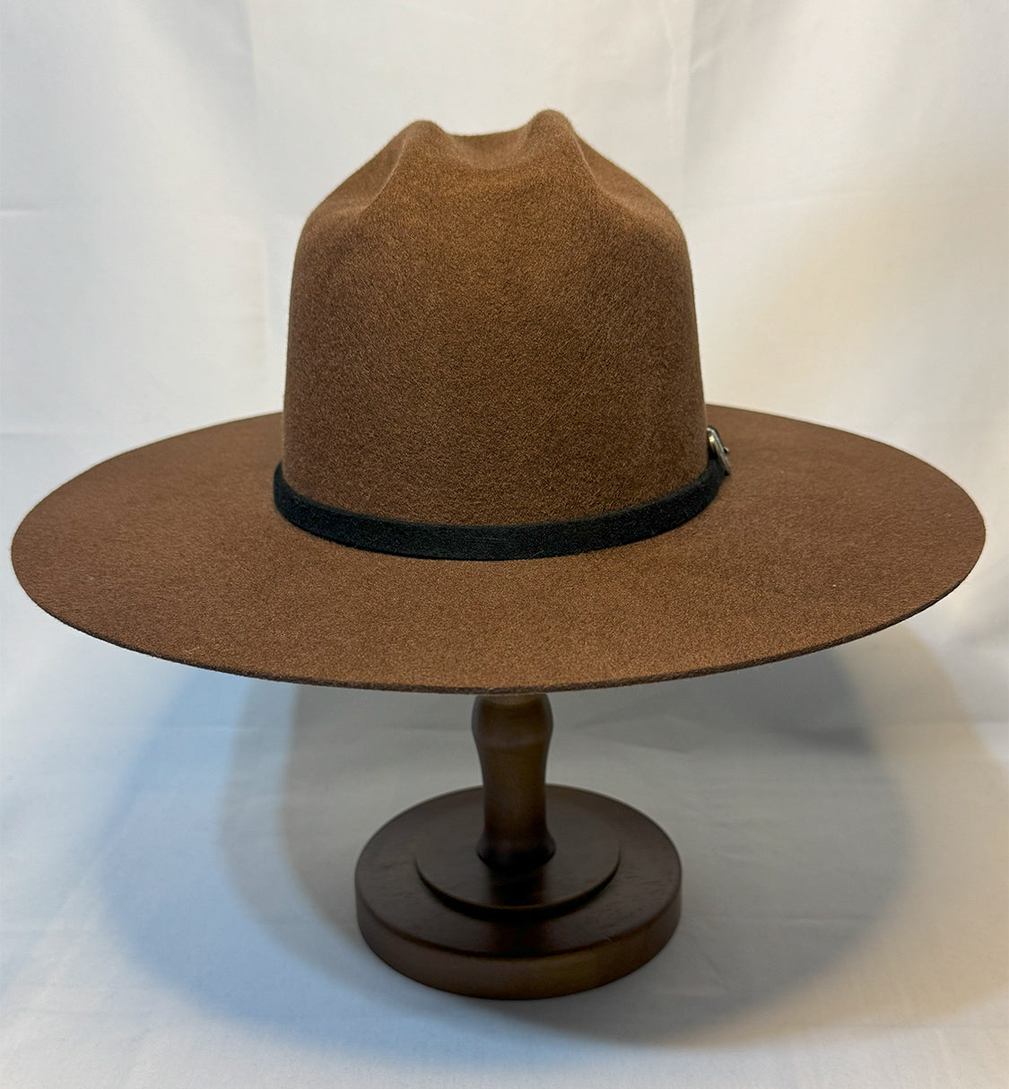 This shallow cattleman crease is a slightly different from the traditional cowboy hat style that features a crease down the middle of the crown and two punch creases on either side. Details includes a sweatband, satin lining, Karda Mendi Hat Pin, Feather and a feather band, as well as a Karda Mendi hat box and “Like Hell If It Is Yours” Hat Card featuring the Troubadour of our family.