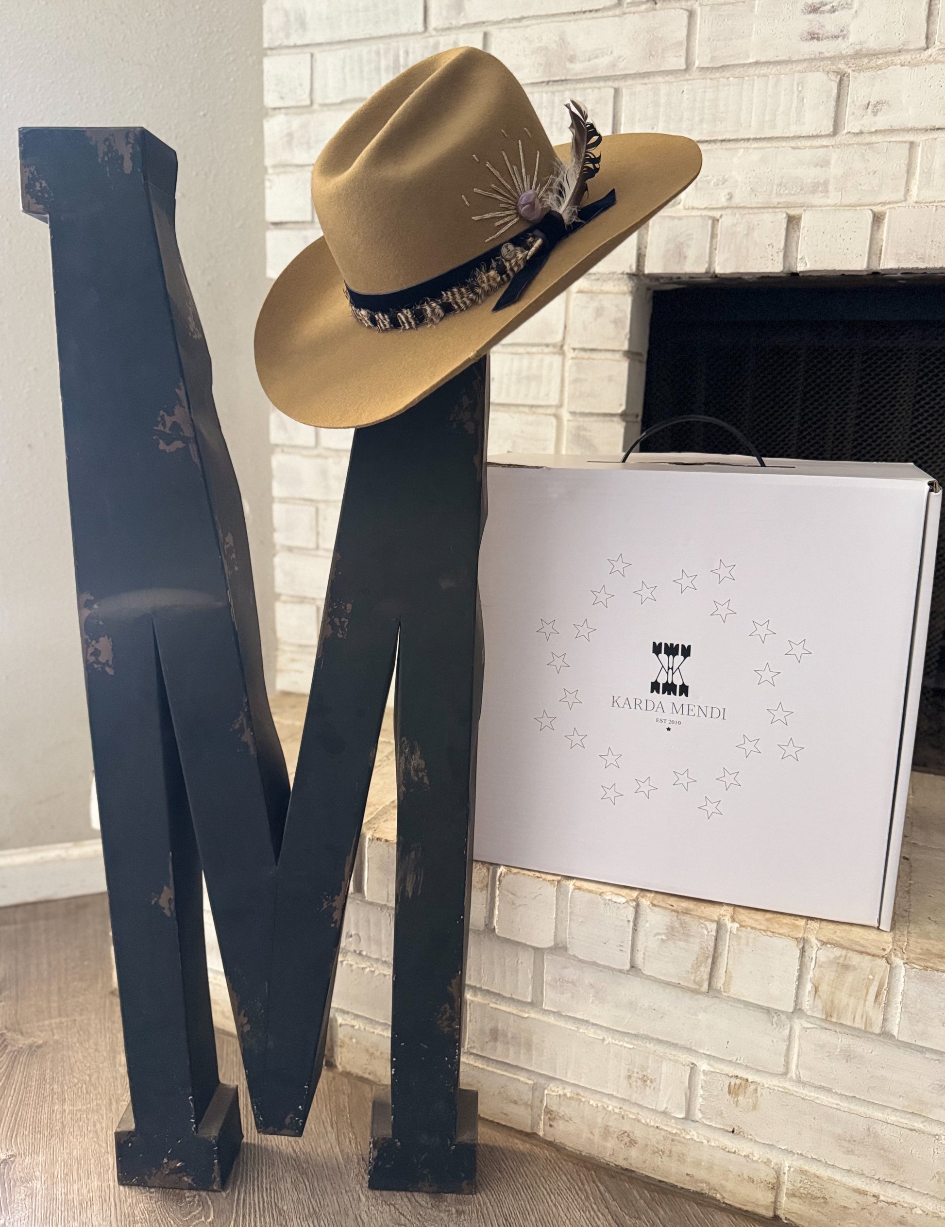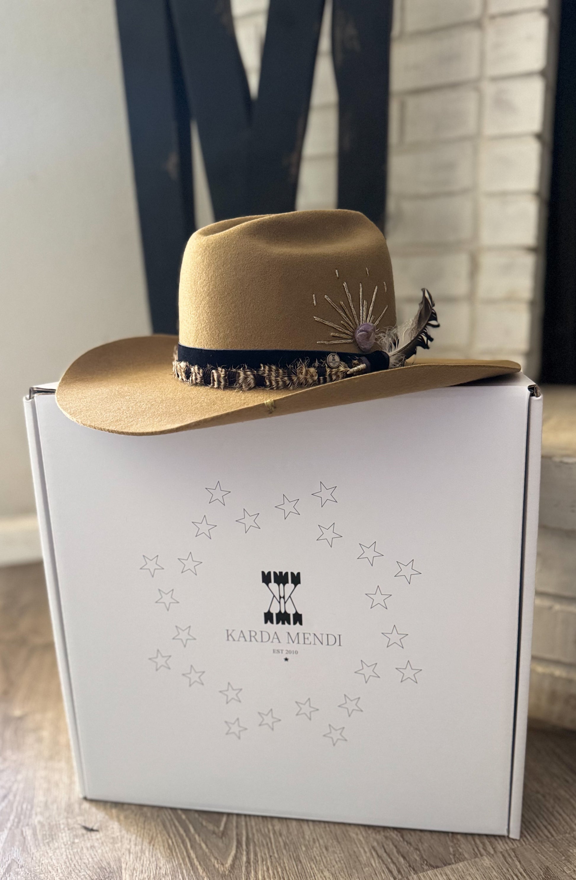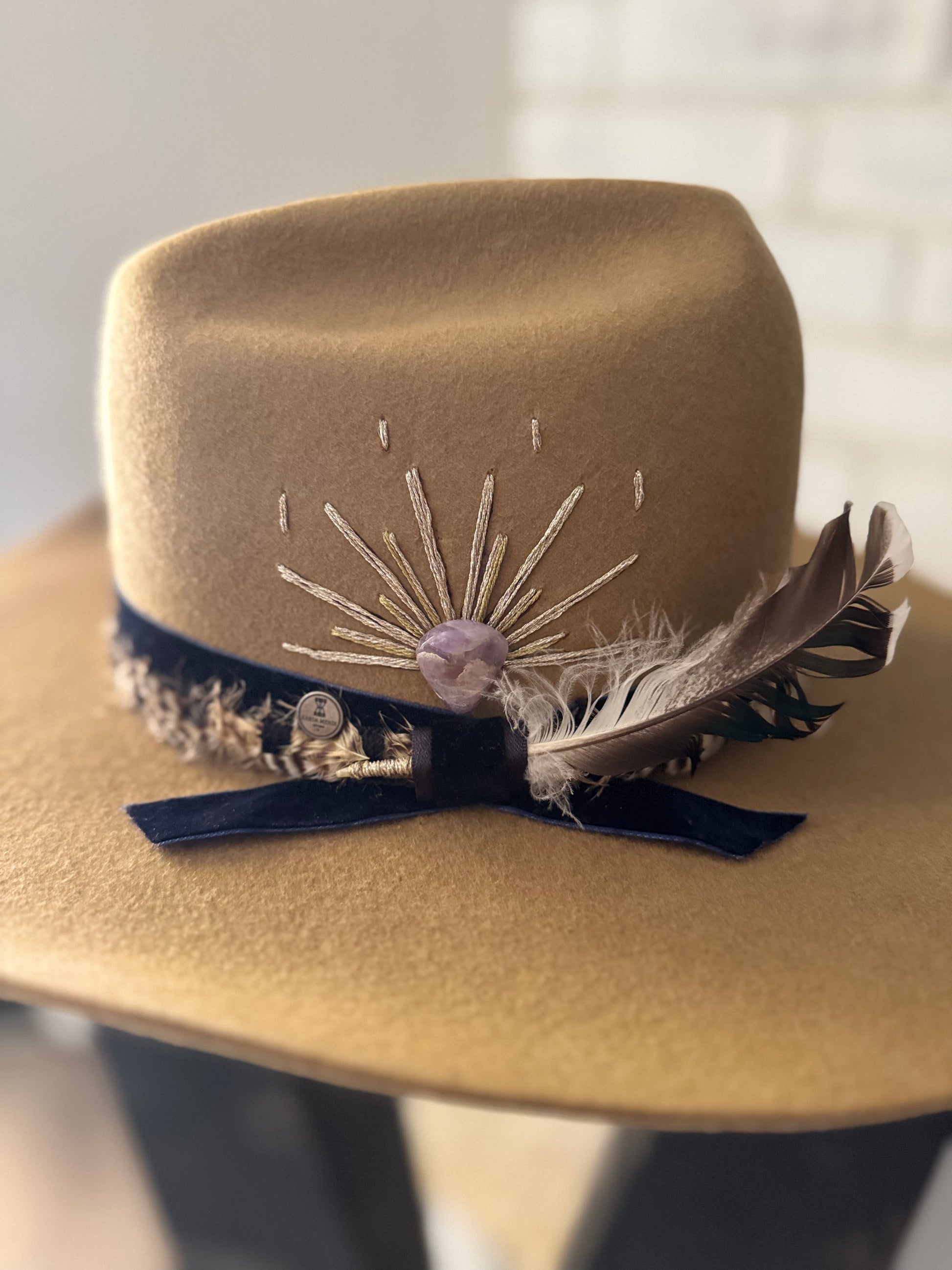 Embrace the thrill of taking risks with the perfect blend of grit and grace. Elevate your style with this unique felt piece. Amethyst stone is bound to inspire your creativity and passion. Includes a blue velvet and feather band combination with black velvet accents.