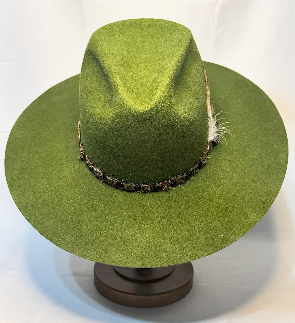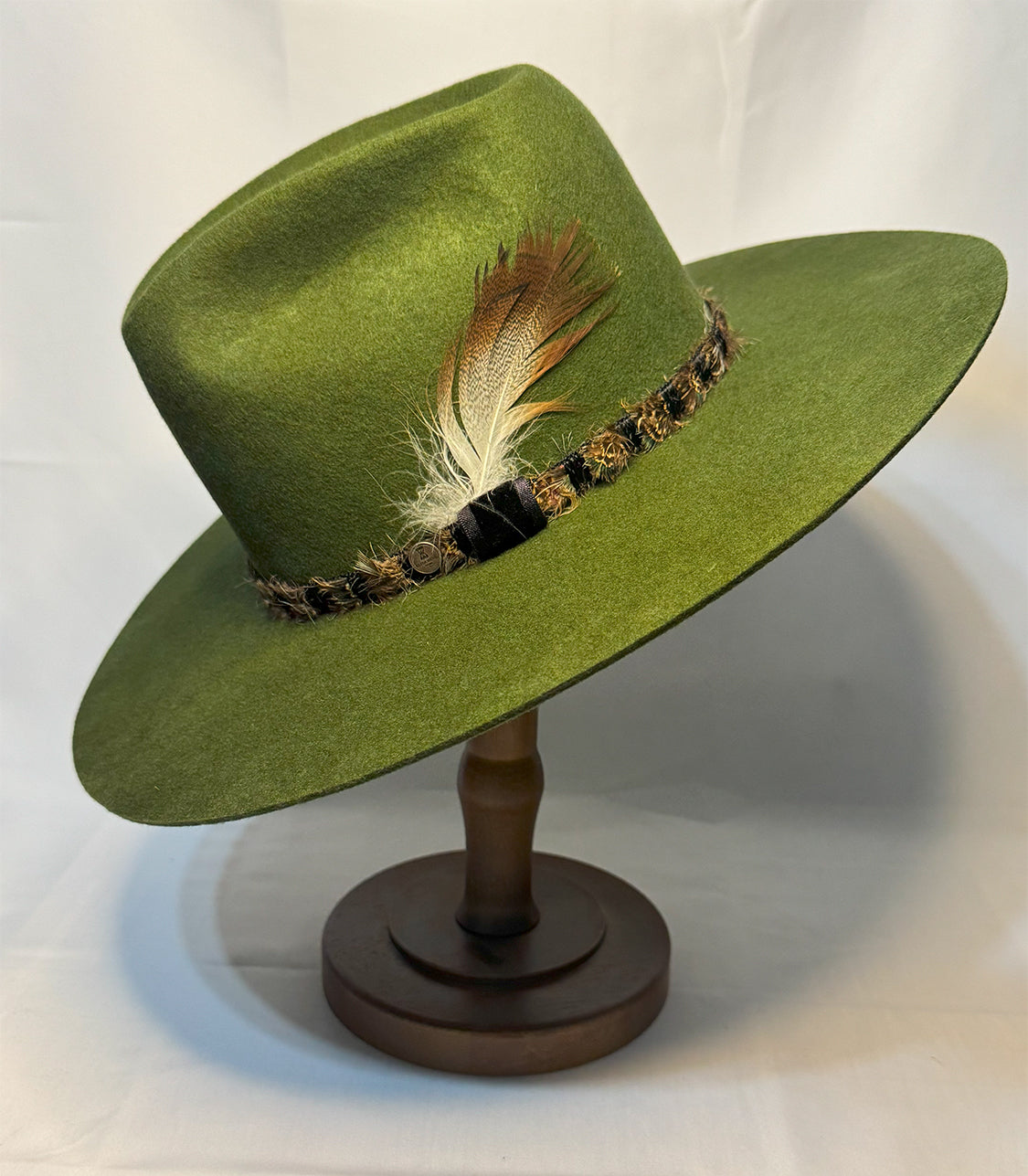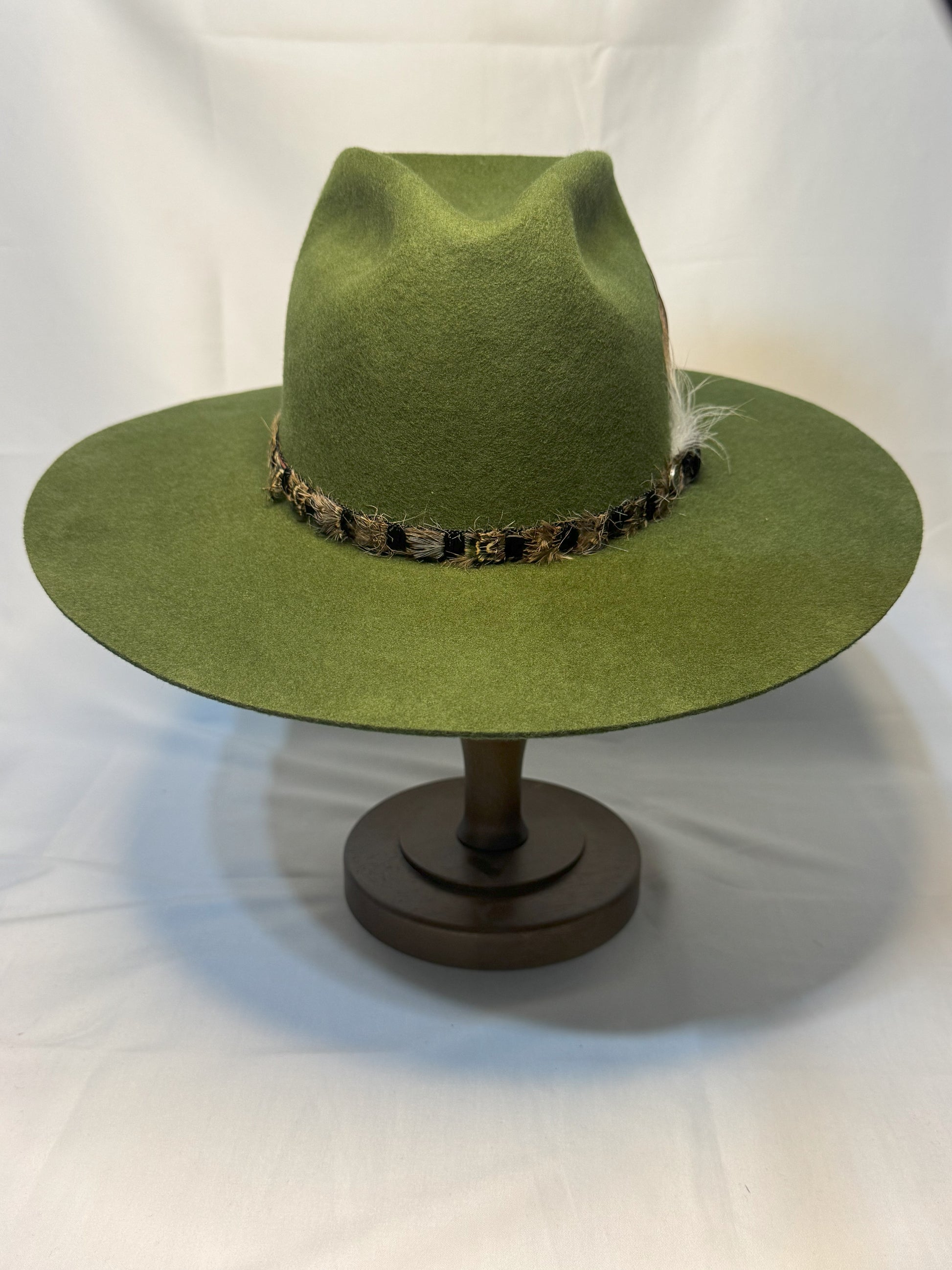 This flat brim is sure to become an icon! This crease style is often associated with a more polished and refined aesthetic compared to other cowboy hat creases. Wearing a tycoon hat crease can be interpreted as a way to project an image of authority, wealth, and success. Details includes a sweatband, satin lining, Karda Mendi Hat Pin, Feather and a feather band, as well as a Karda Mendi hat box and “Like Hell If It Is Yours” Hat Card featuring the Troubadour of our family.