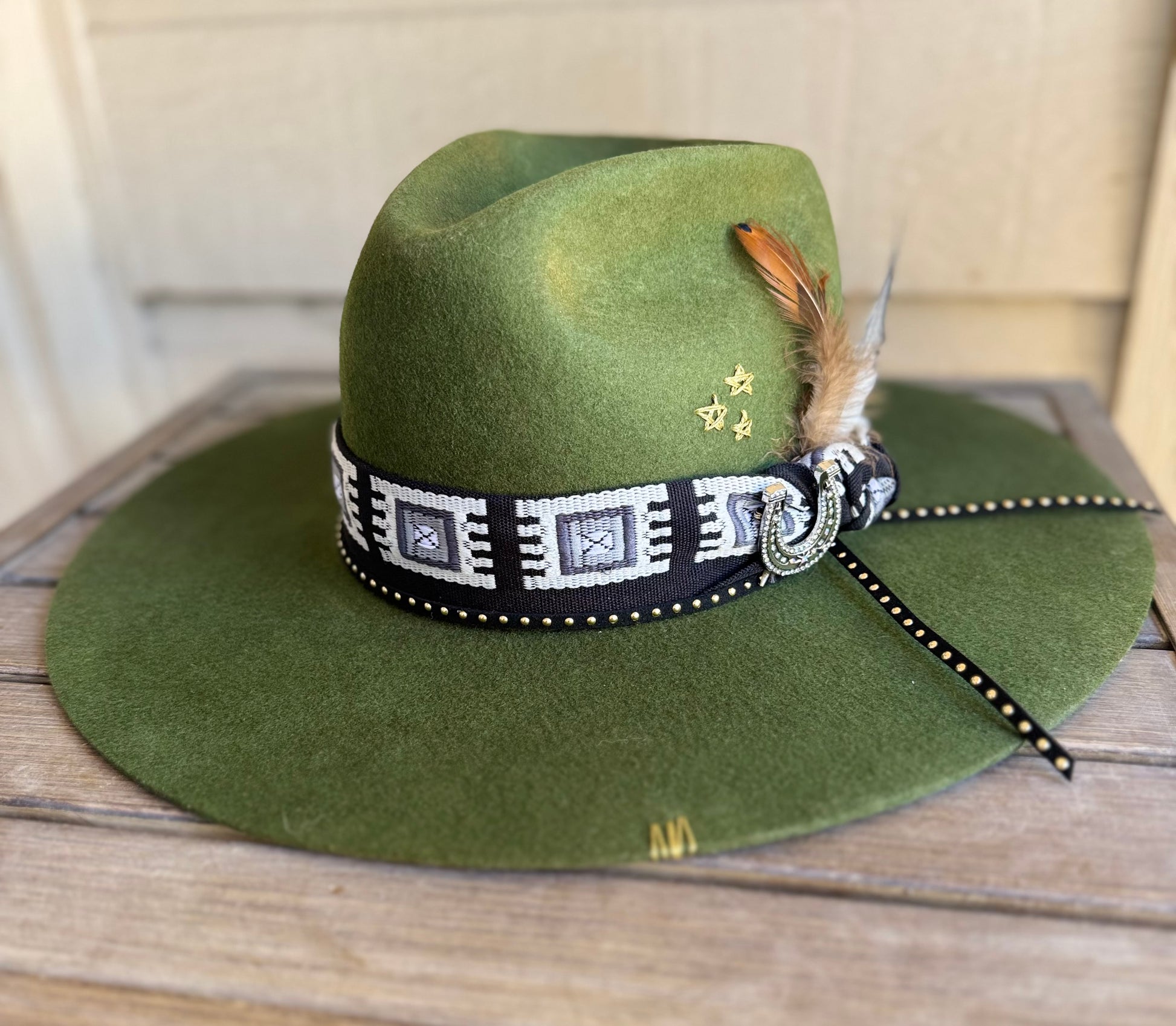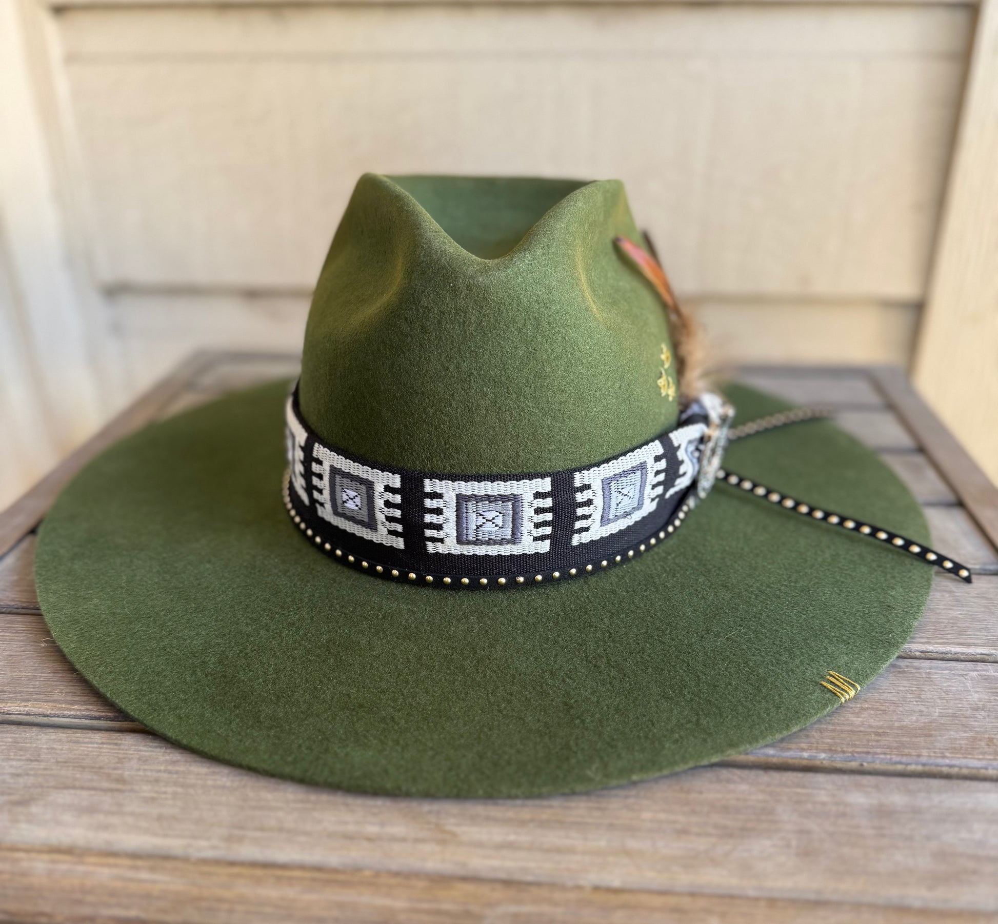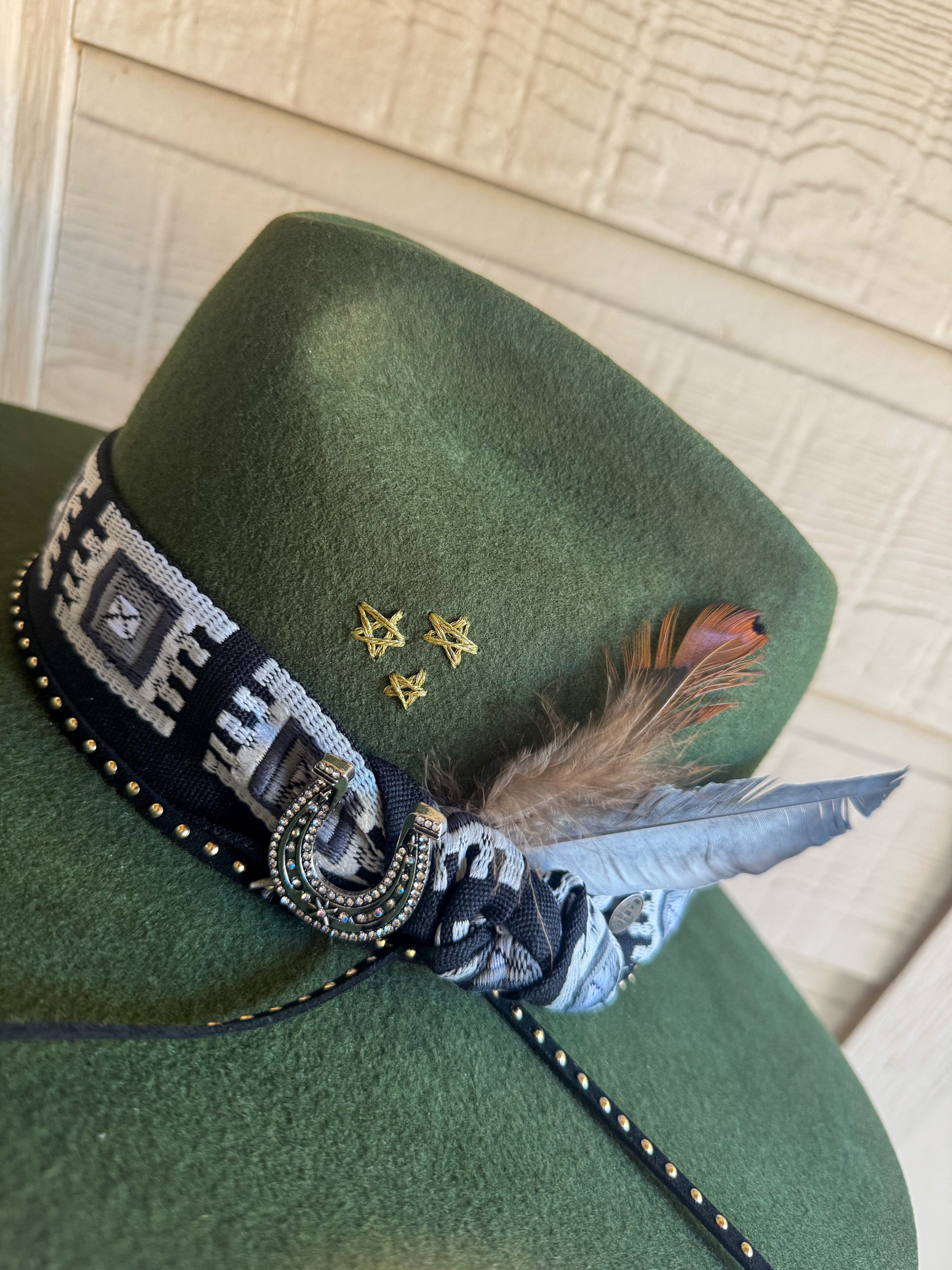Take a chance and rock out with this unique country hat! Its one-of-a-kind design is bound to impress and add some flair to your concert ensemble. Don't miss out on adding this felt hat to your wardrobe.