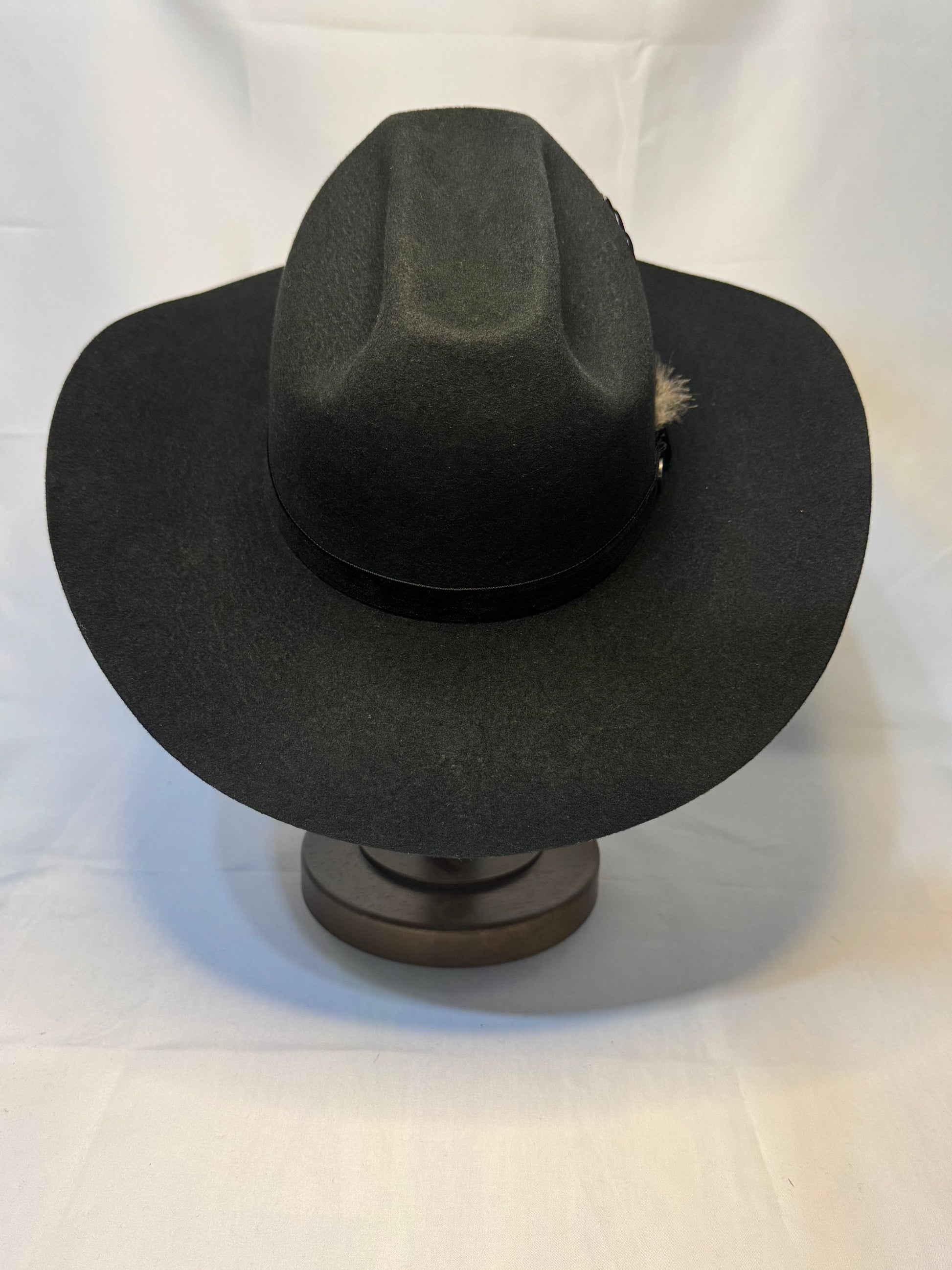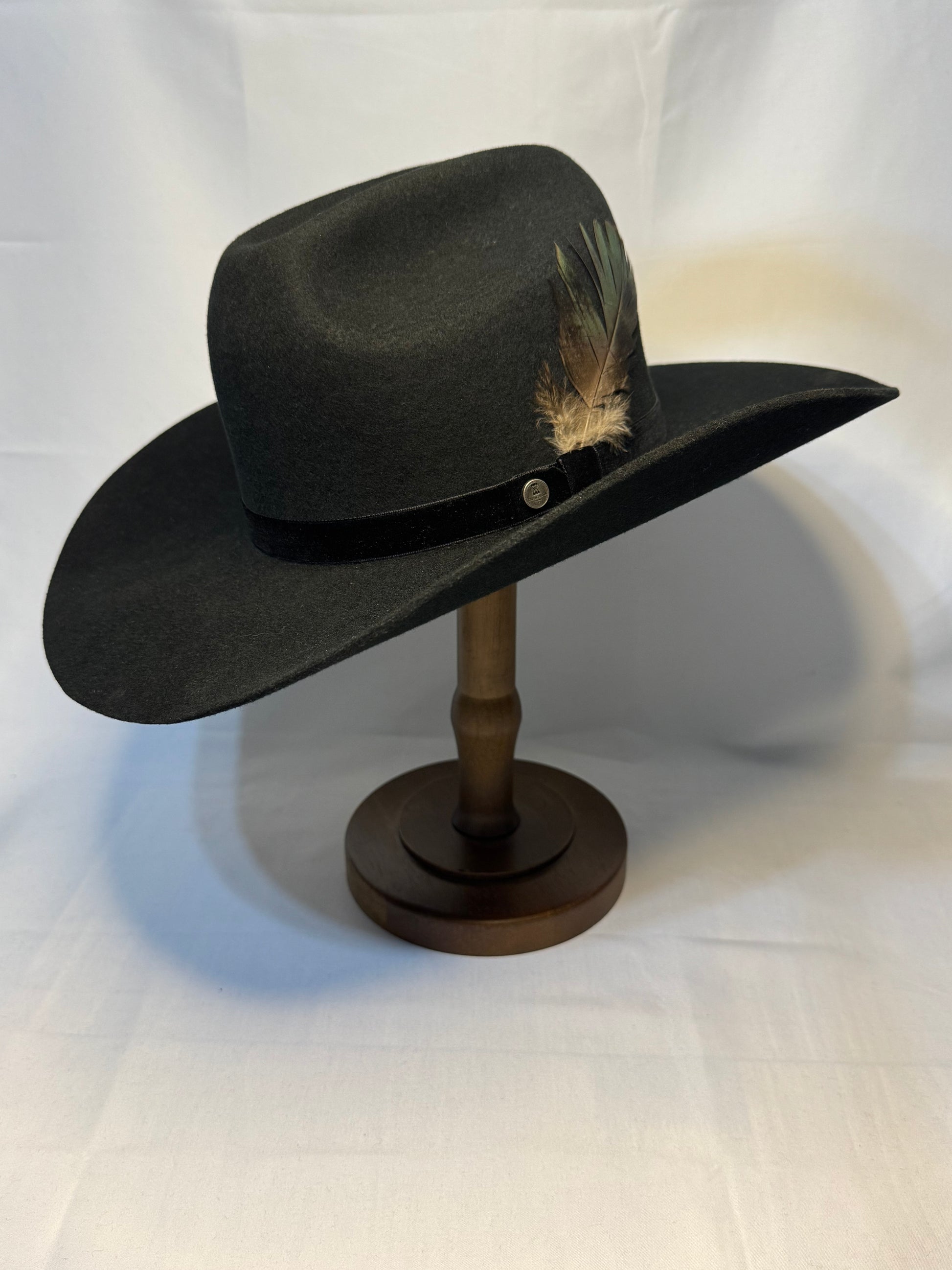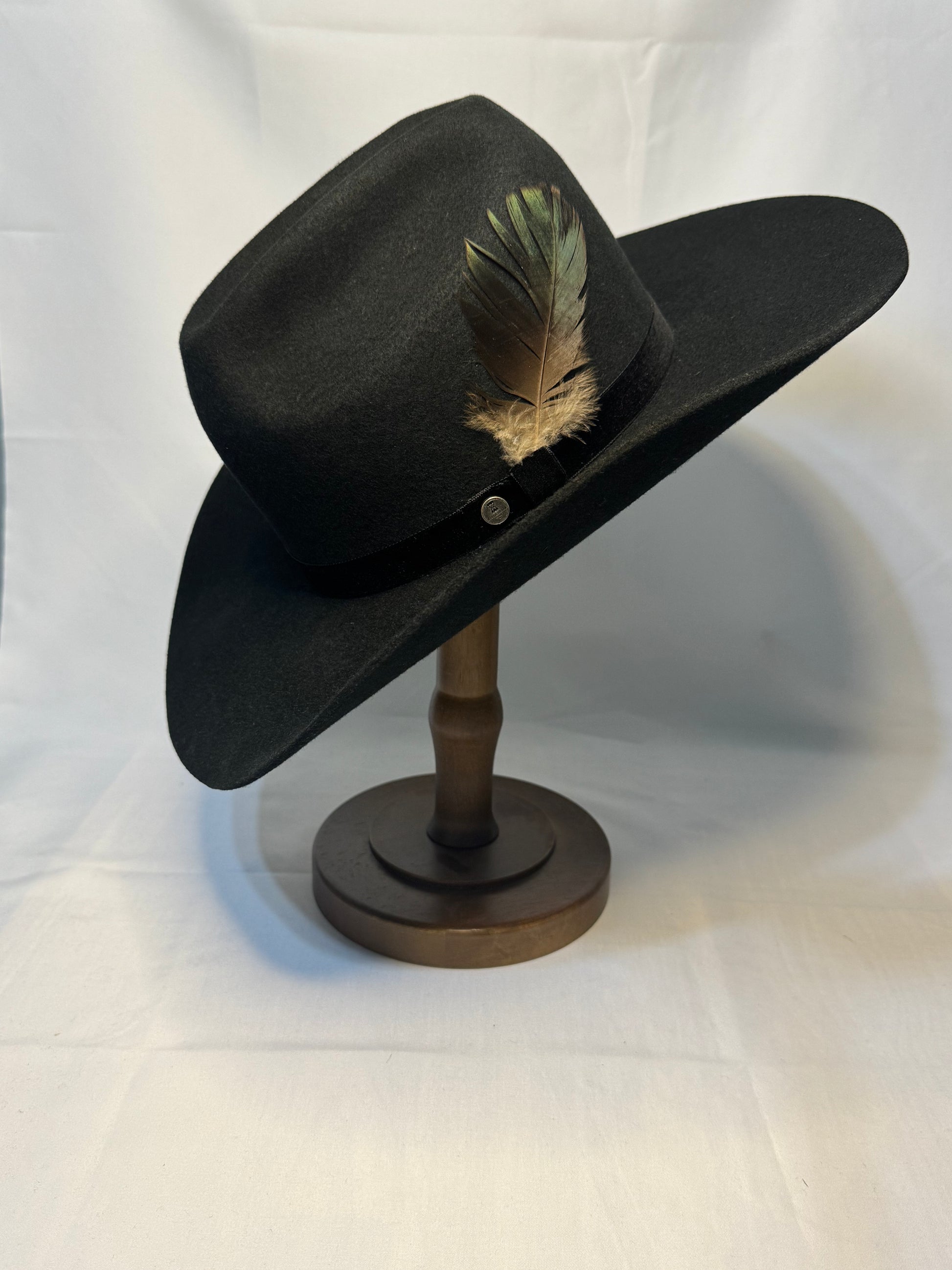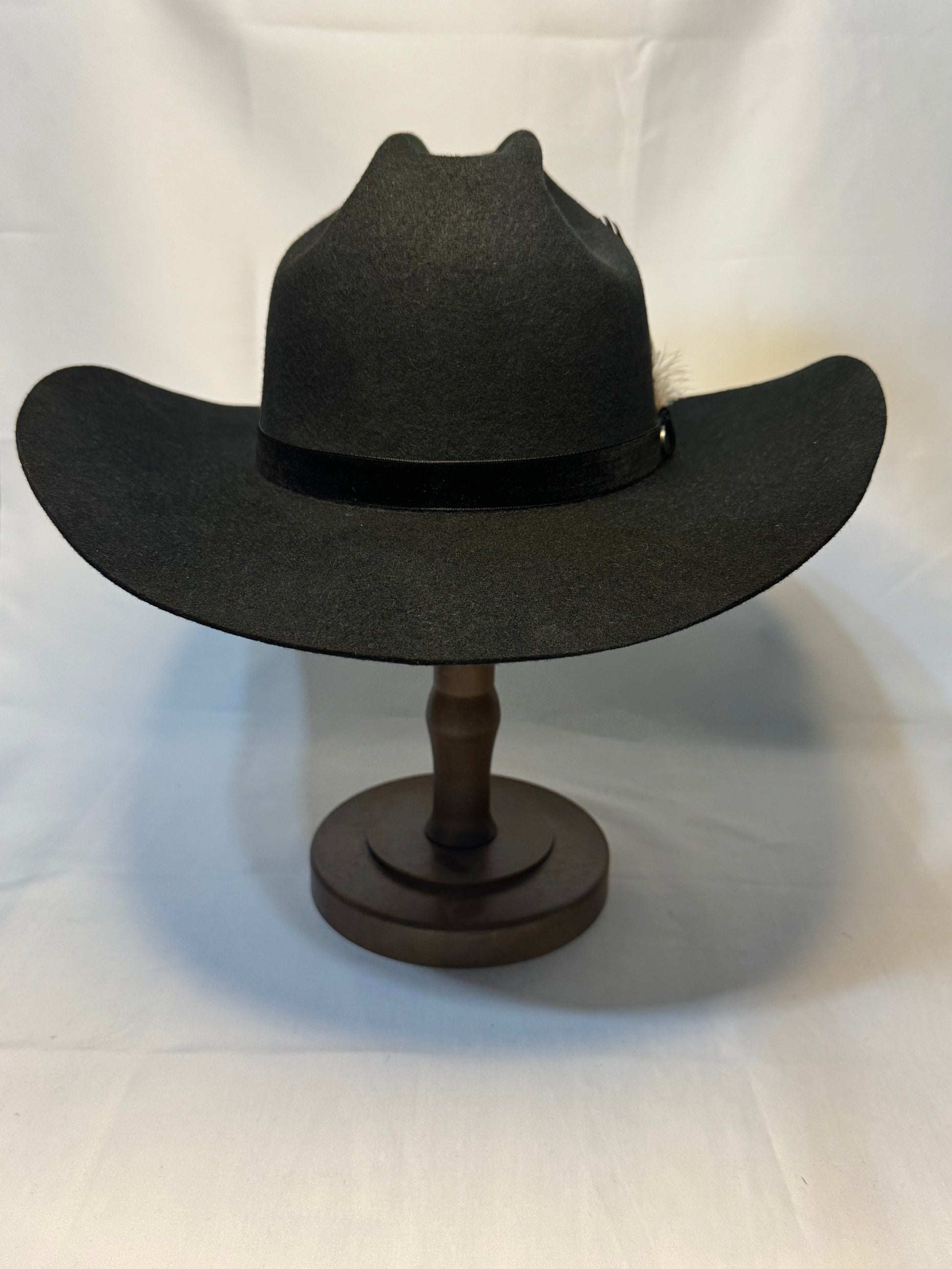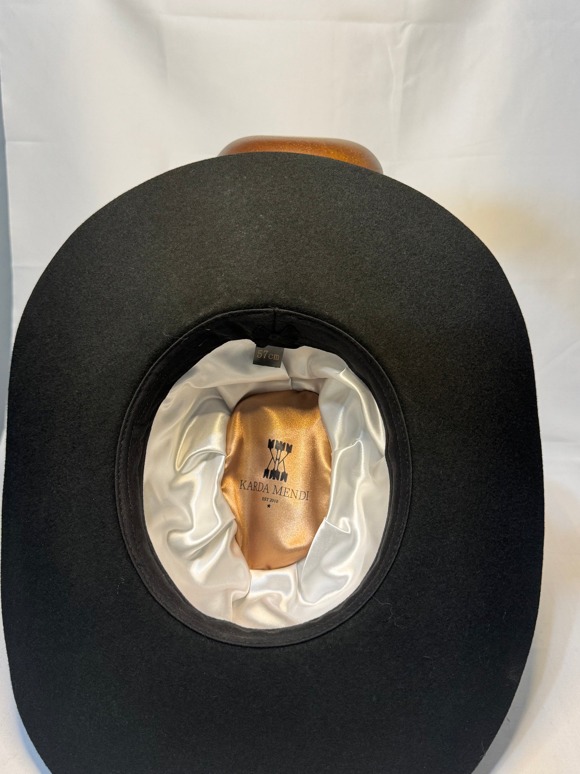This classic hat is sure to be your next go to! The cattleman crease is a traditional cowboy hat style that features a crease down the middle of the crown and two creases on either side. Details includes a sweatband, satin lining, Karda Mendi Hat Pin, Feather and a feather band, as well as a Karda Mendi hat box and “Like Hell If It Is Yours” Hat Card featuring the Troubadour of our family.